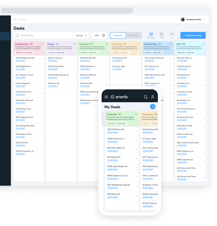 Clearly see where each customer is in the sales process, and easily pick up where you left off to move them forward. Enerflo gives you visibility into all your customer interactions and guides you through what to do within each stage.